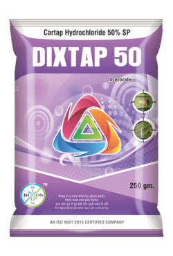 • Mode of Action:Dixtap 50 is of Nereistoxin analogue group, which gives effective control on insects through its contact, systemic and stomach action. Dixtap 50 SP has remarkable capacity to control biting, chewing and sucking type of insects. It is suitable insecticide