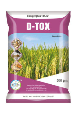 • Mode of Action:D- Tox is a broad-spectrum insecticide that kills insects upon contact by affecting the normal function of the nervous system. When insects are exposed, chlorpyrifos binds to the active site of the cholinesterase (ChE) enzyme, which prevents breakdown of