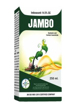 • Mode of Action:Jambo is Contains Indoxacarb 14.5 % SC is a New technology insecticide, effective by its contact or Feeding poison action. Jambo is a non-systemic insecticide which is widely used for the control Chewing Insects like Bollworm, Pink B